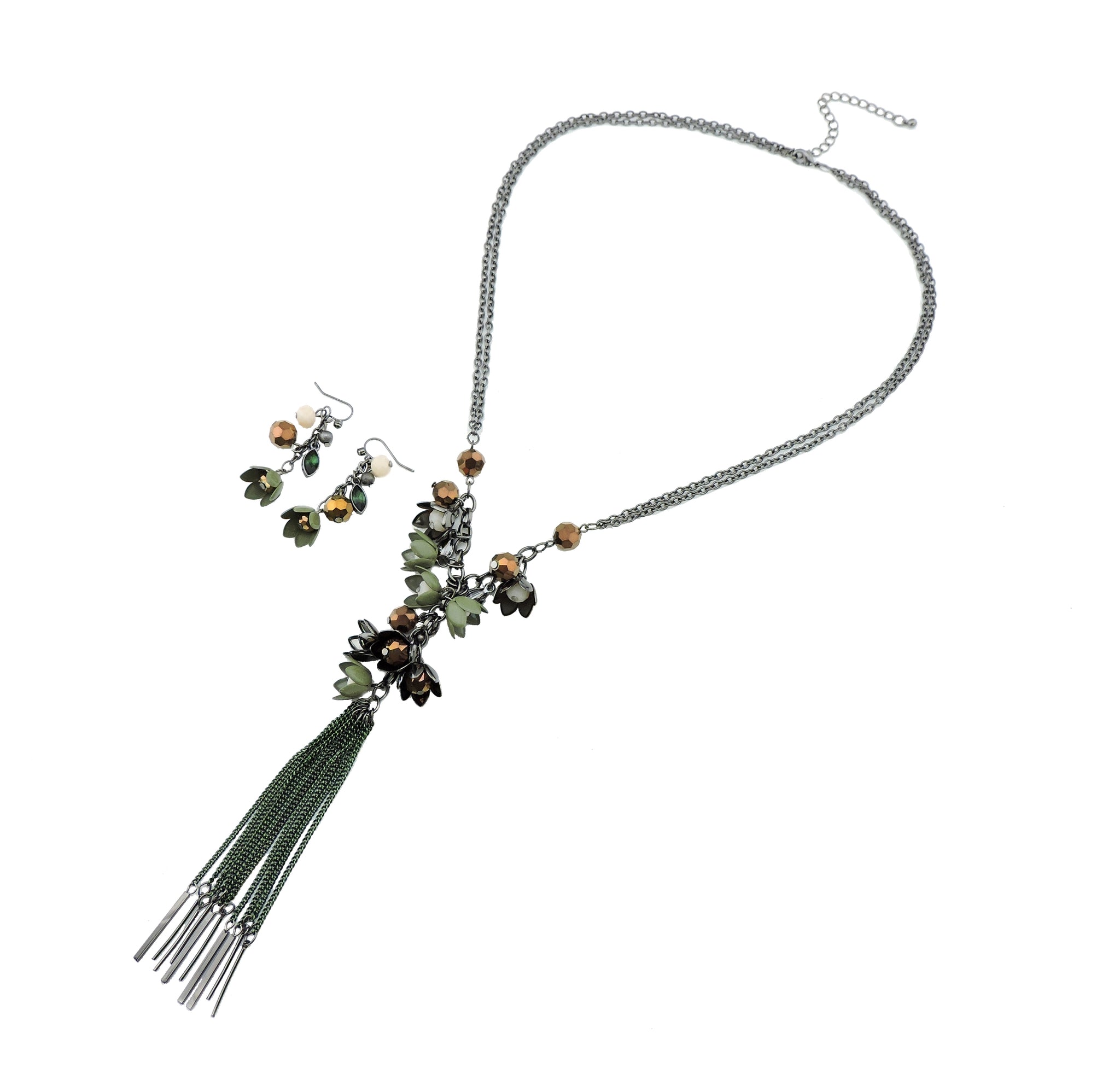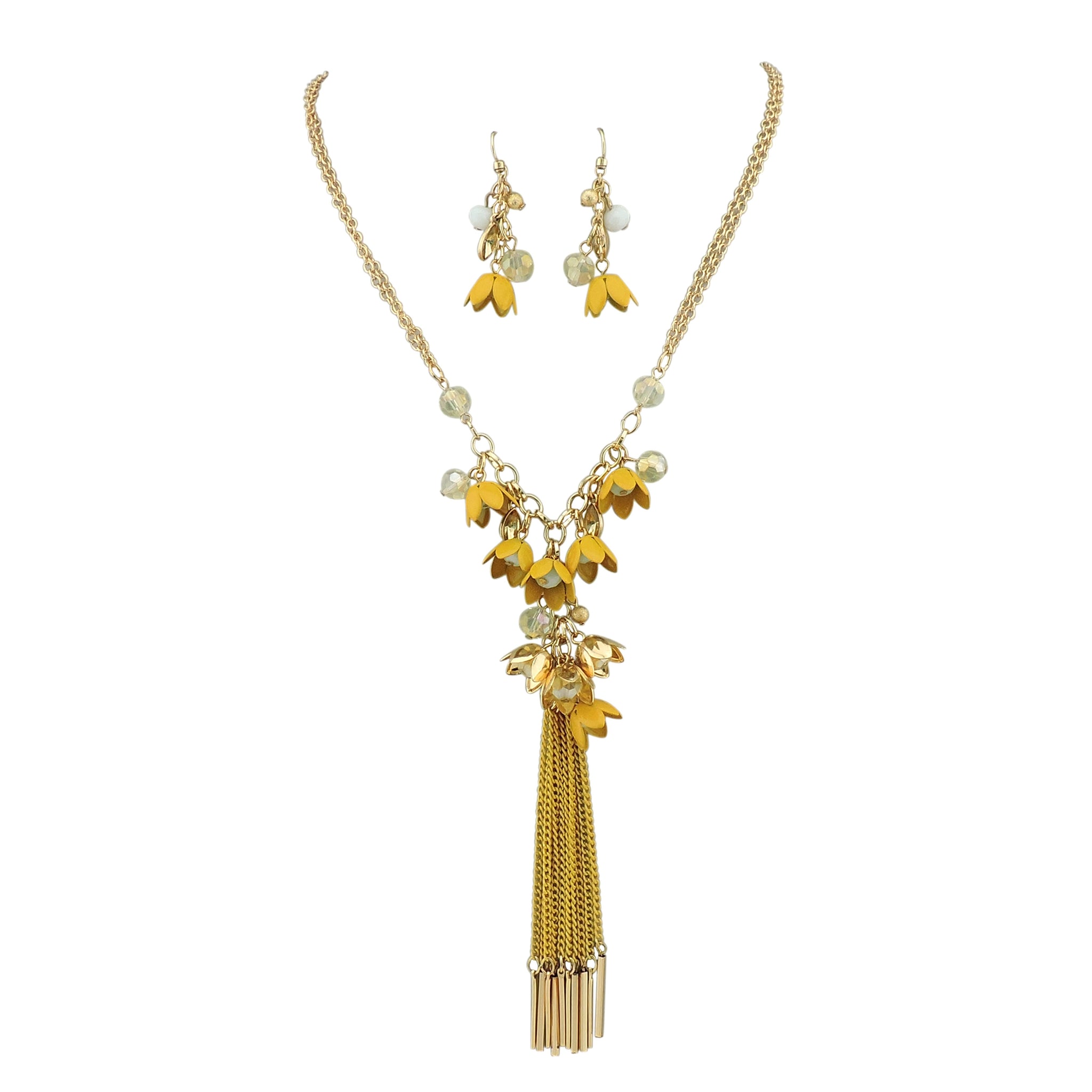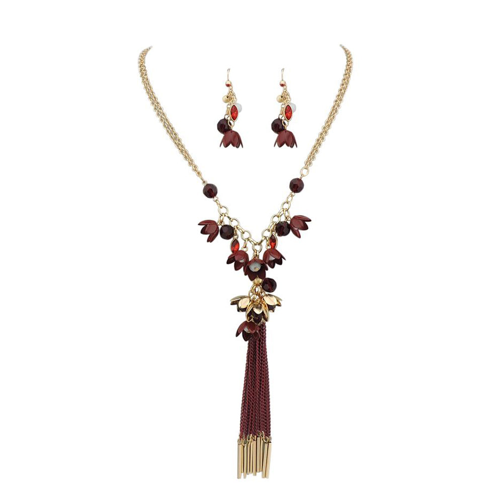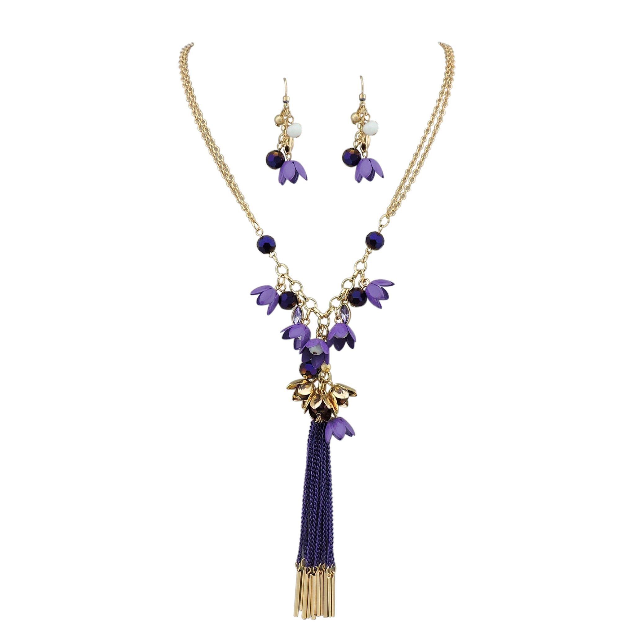 Bocar Long 2 Layer Chain Unique Flower Pendant Tassels Necklace Earrings Women Jewelry Set