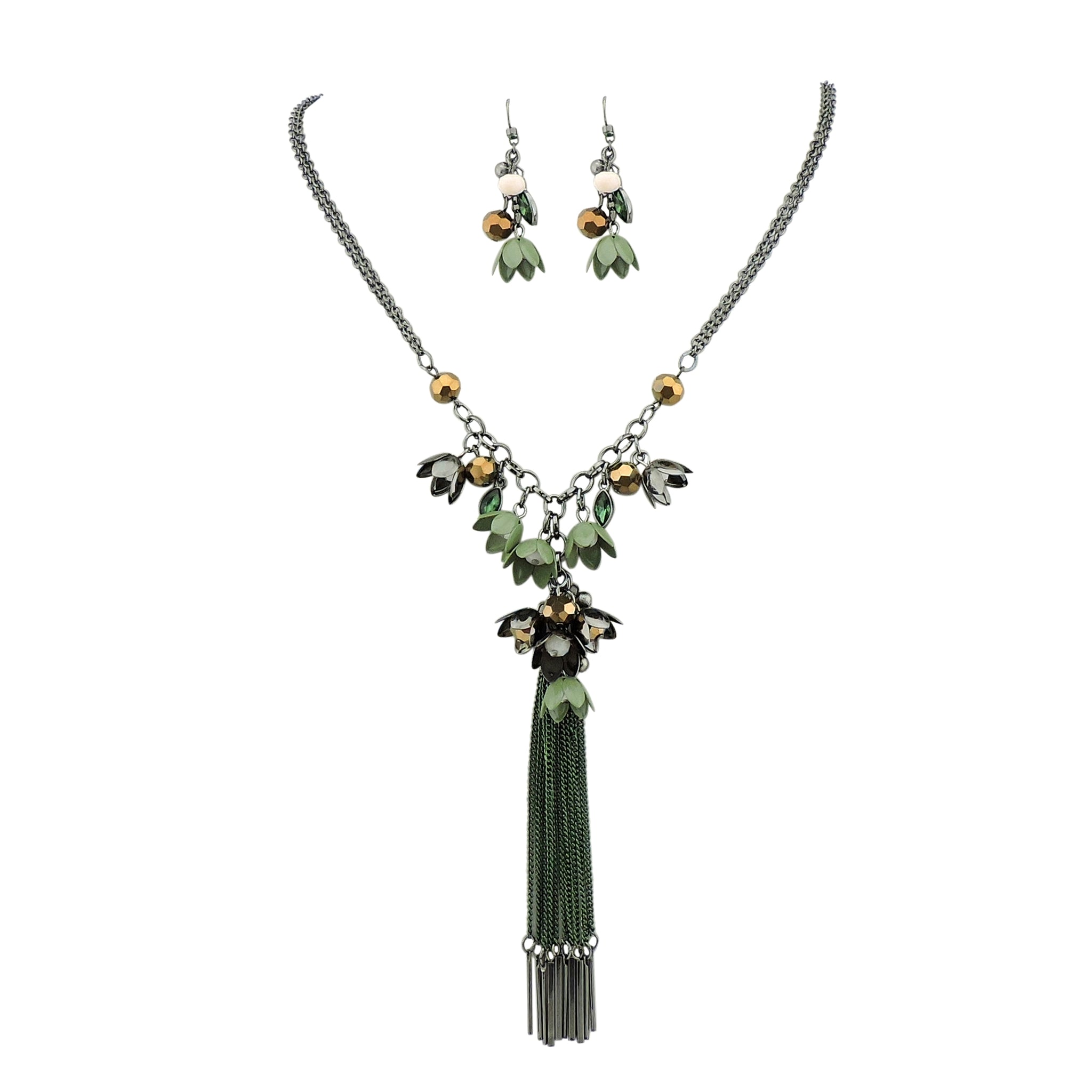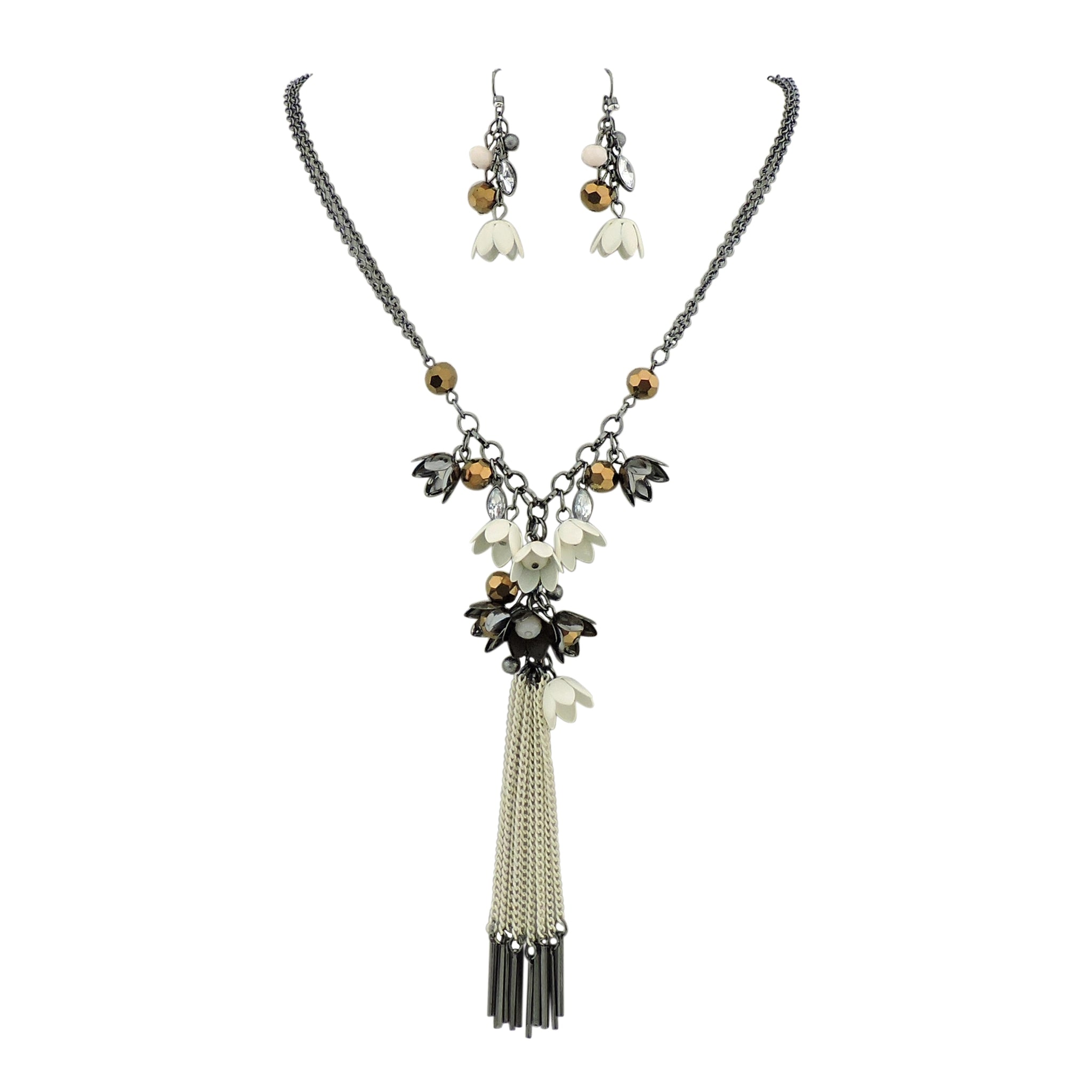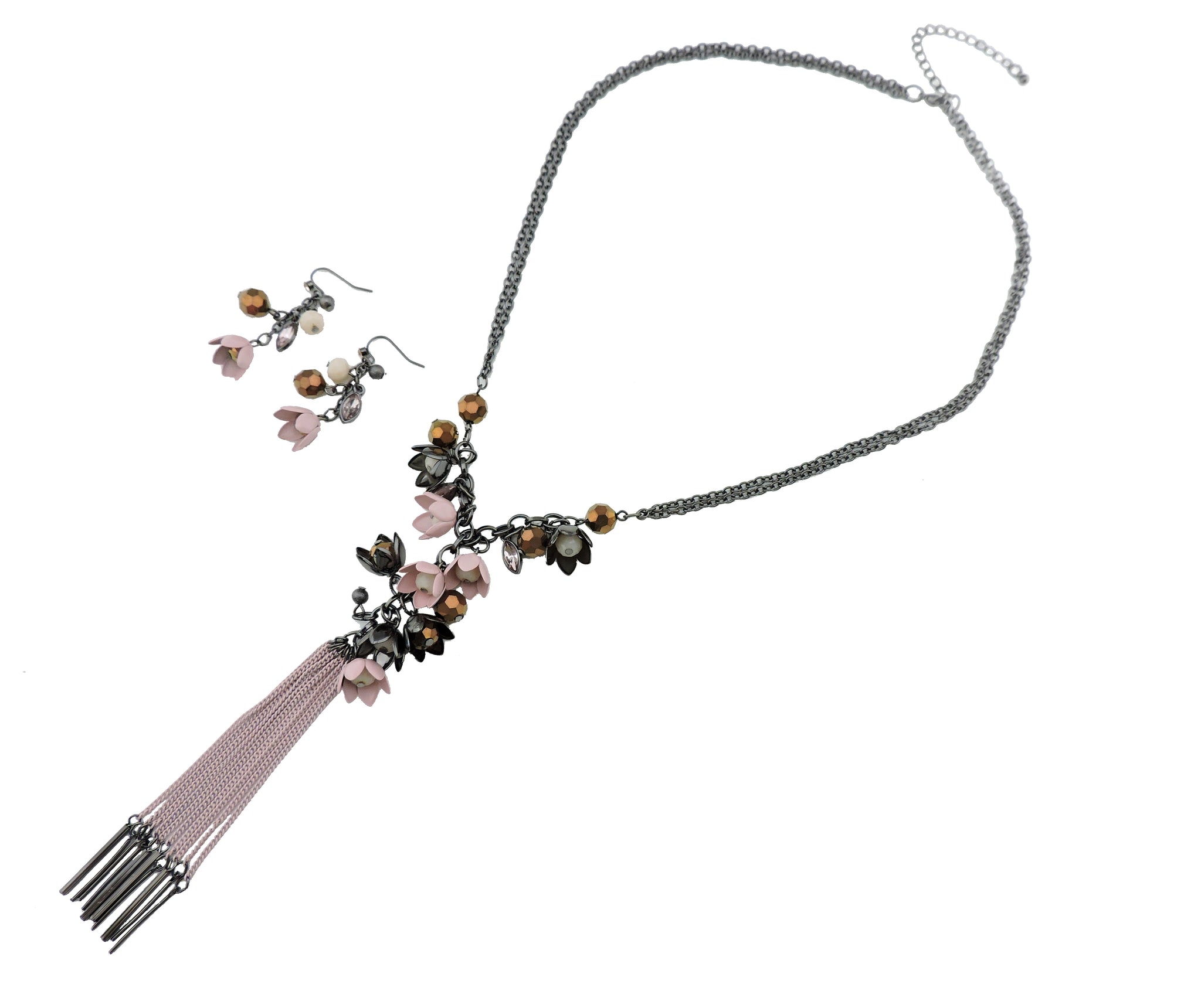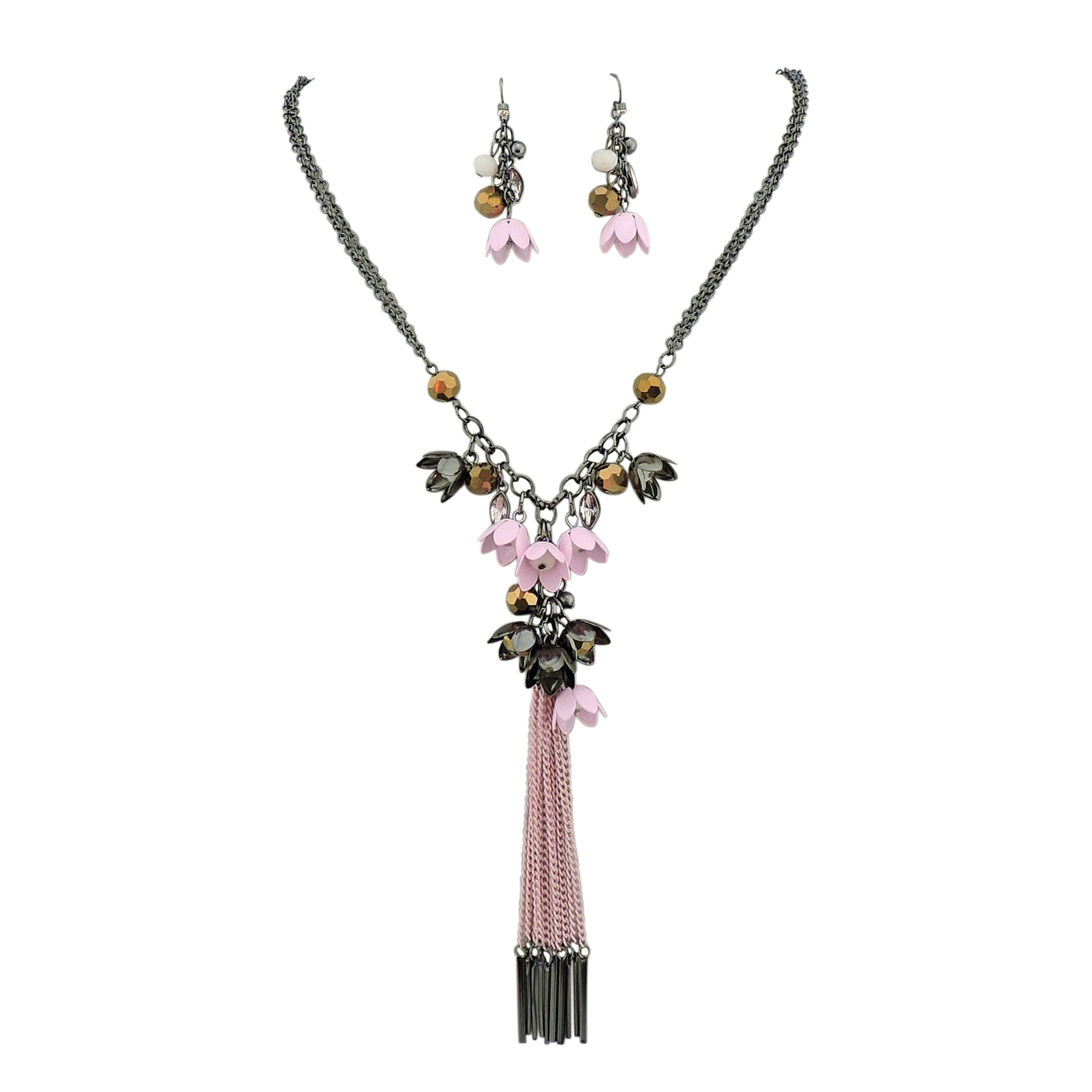 Bocar Long 2 Layer Chain Unique Flower Pendant Tassels Necklace Earrings Women Jewelry Set