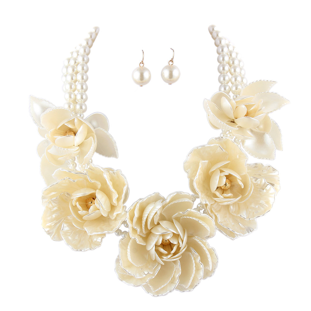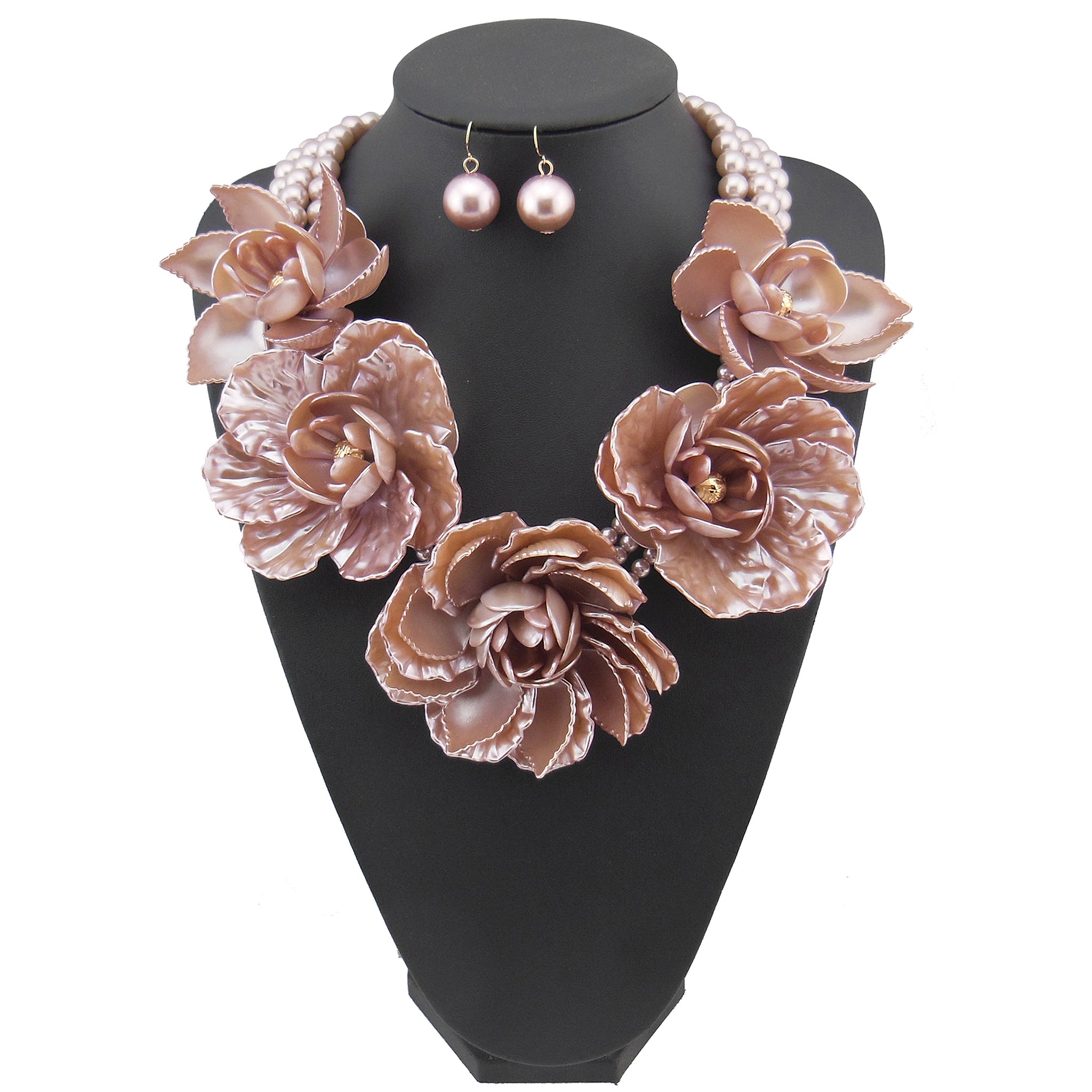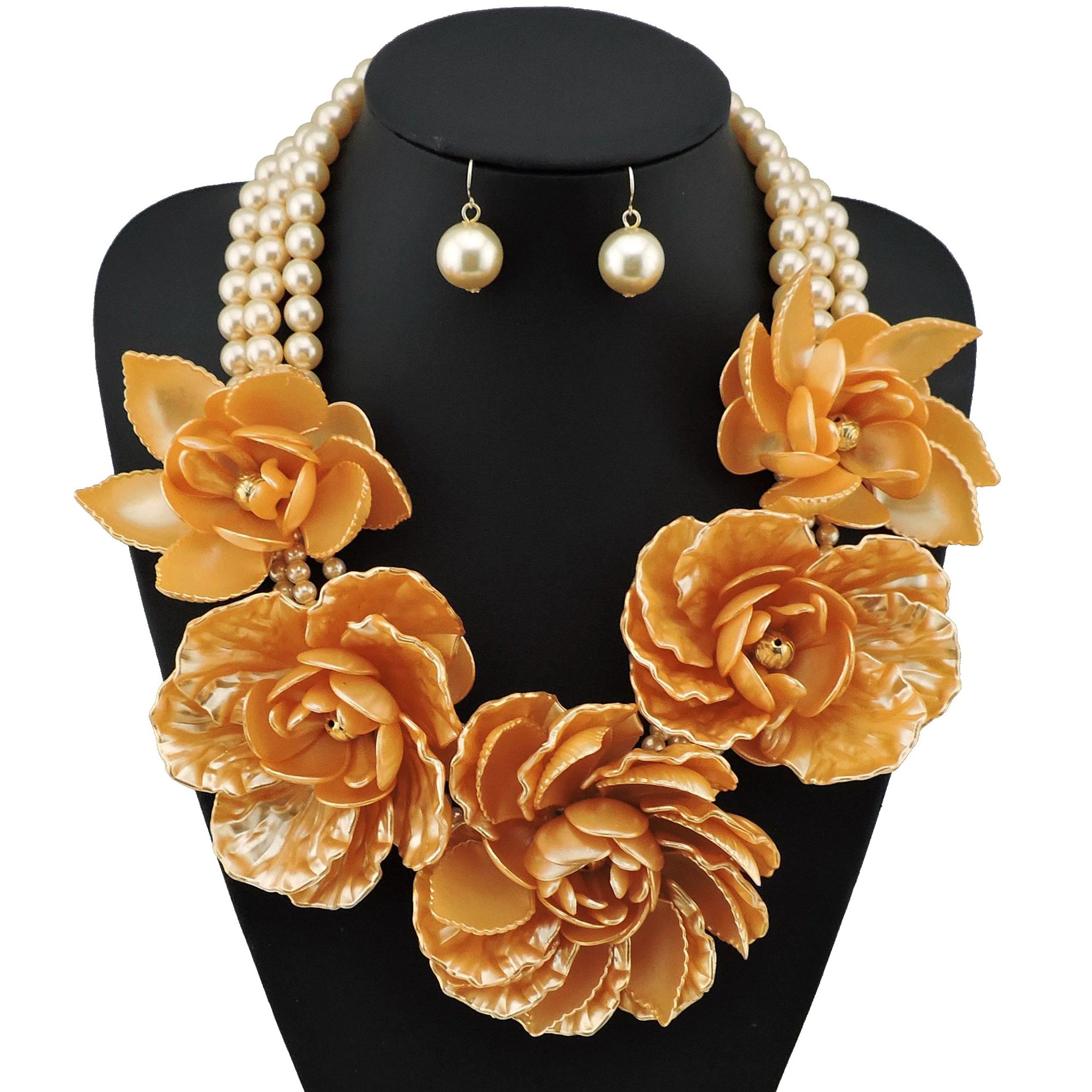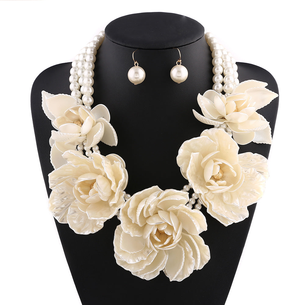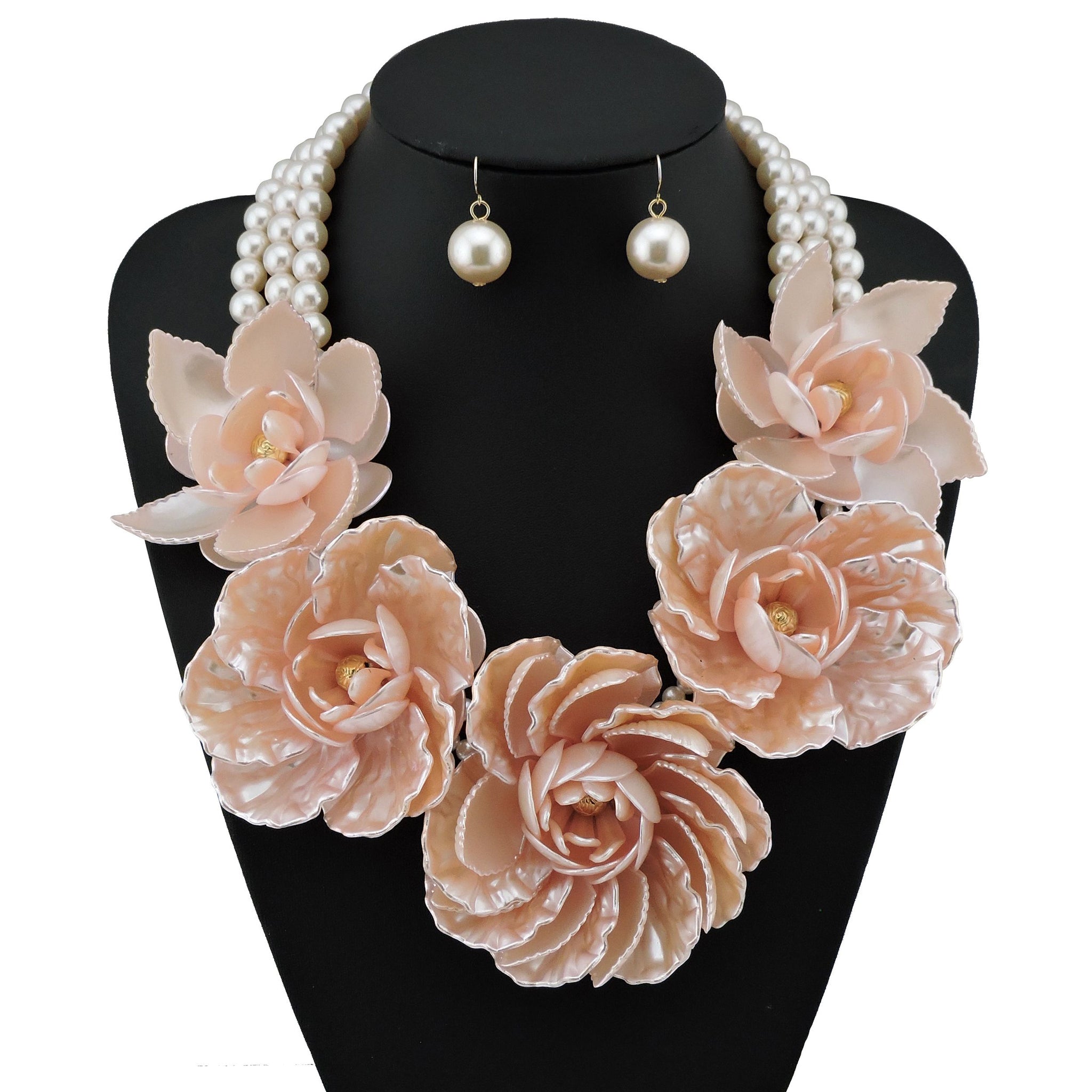BOCAR Statement Big Pendant Pearl Flower Necklace Earrings Jewelry Set for Women